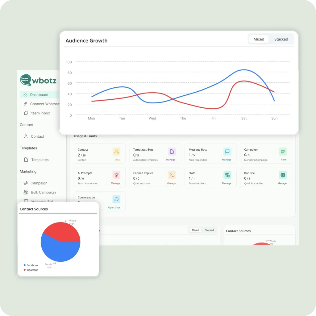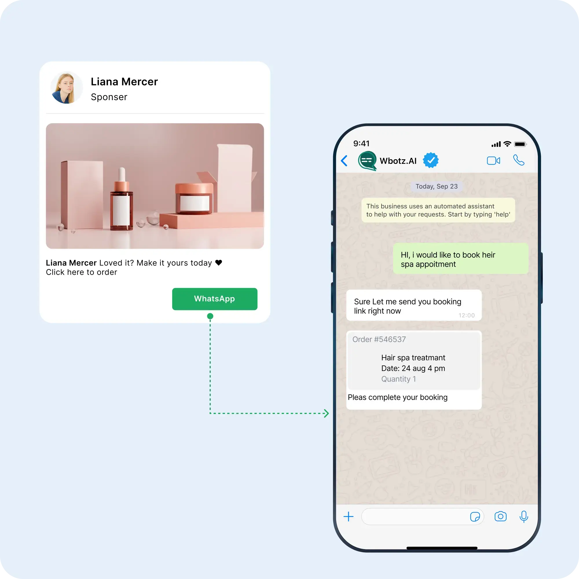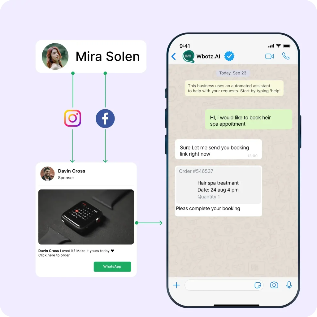 Transform social media scrollers into engaged customers with Click-to-WhatsApp Ads. Skip landing pages, eliminate form friction, and connect directly with high-intent prospects through Facebook and Instagram ads that open WhatsApp chats instantly. With wbotz as your trusted Meta partner, create CTWA campaigns that deliver 5X higher conversion rates and capture 100% of your leads.