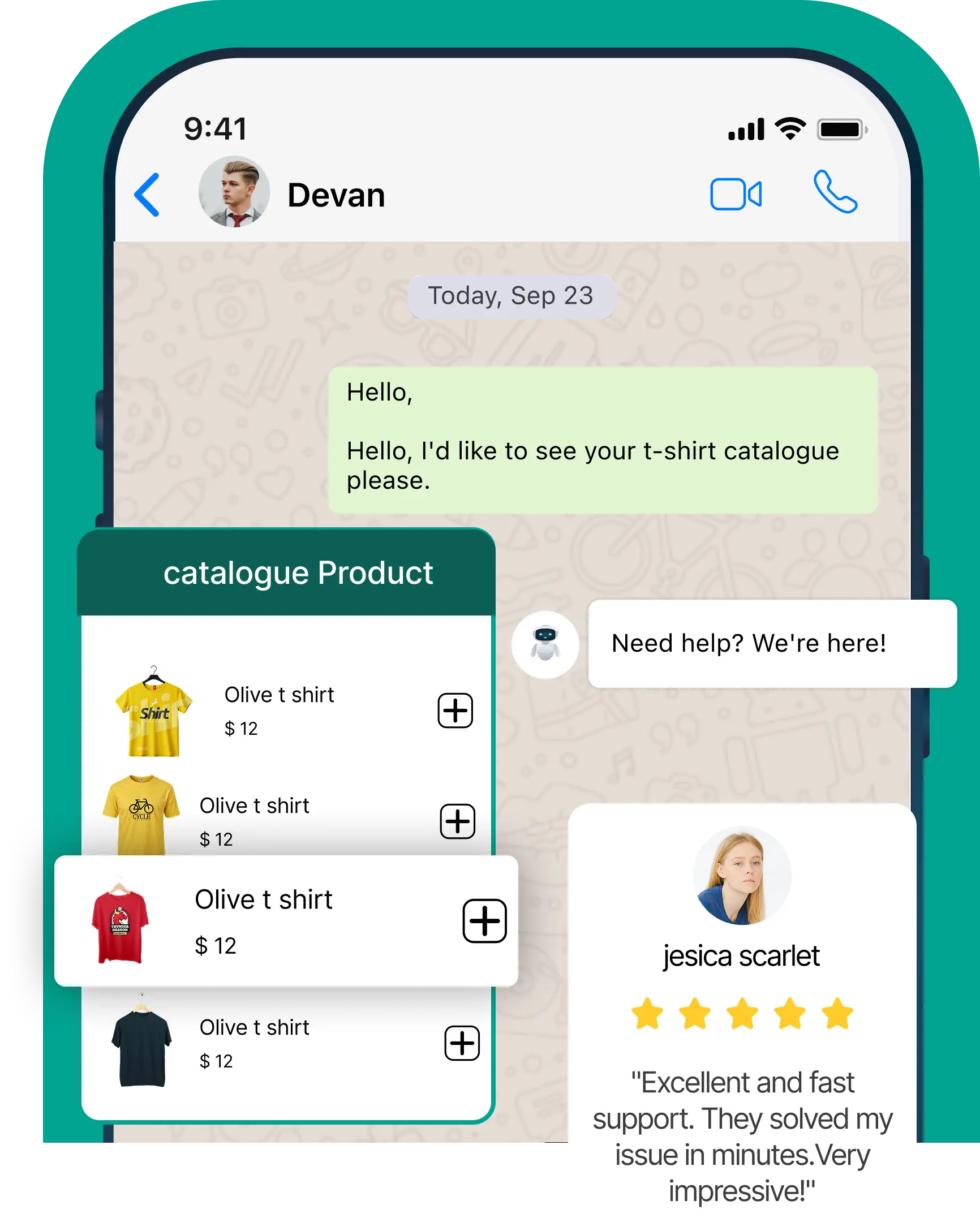 Send broadcasts of new arrivals, flash sales, and personalized offers; share full product catalogs rich with images and pricing to drive impulse purchases.