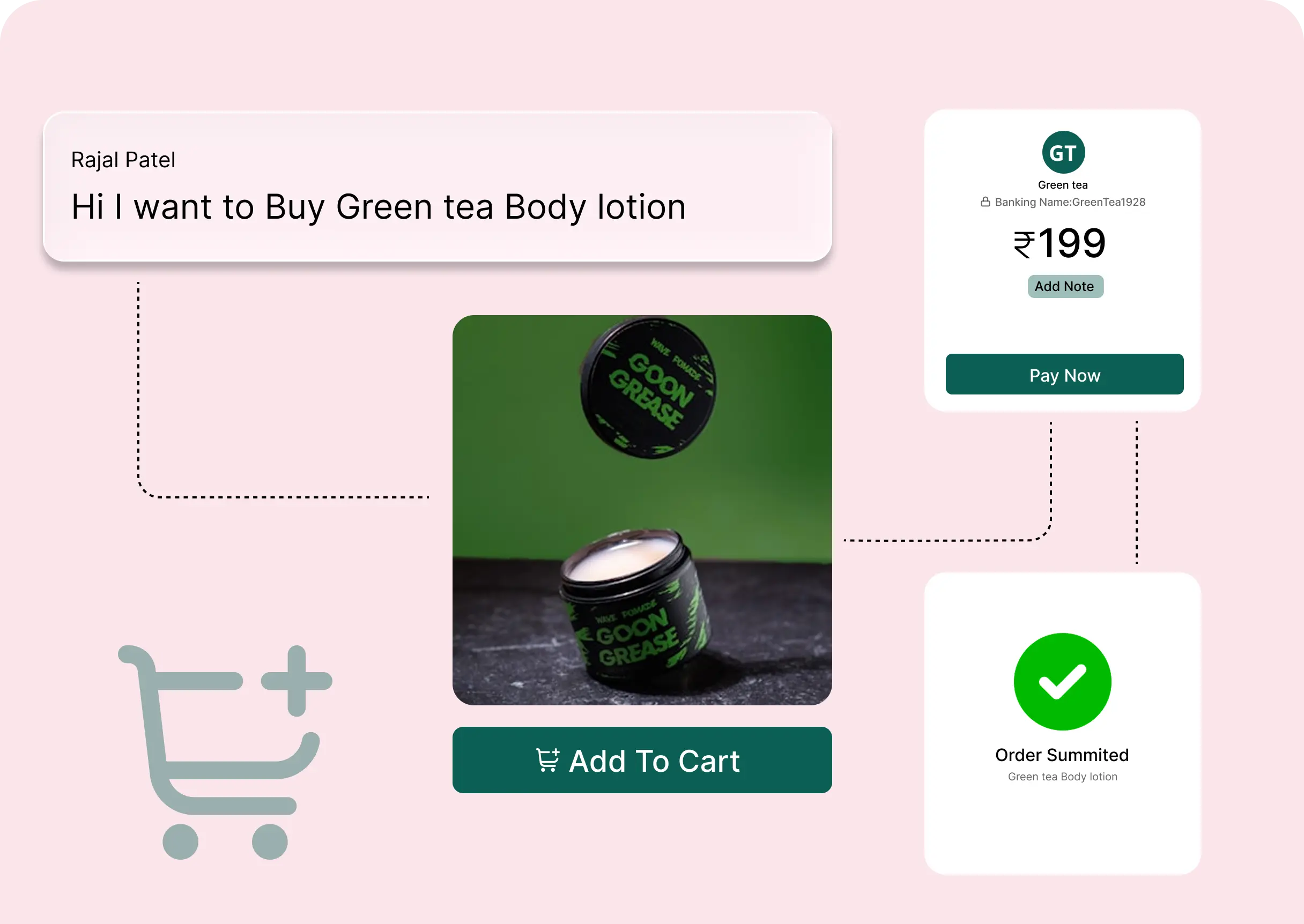Customers can discover products, ask questions, add to cart, and place orders directly in chat—eliminating the need to navigate websites or switch apps.