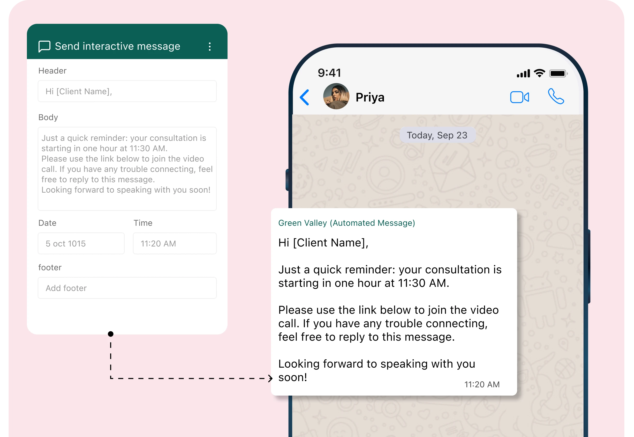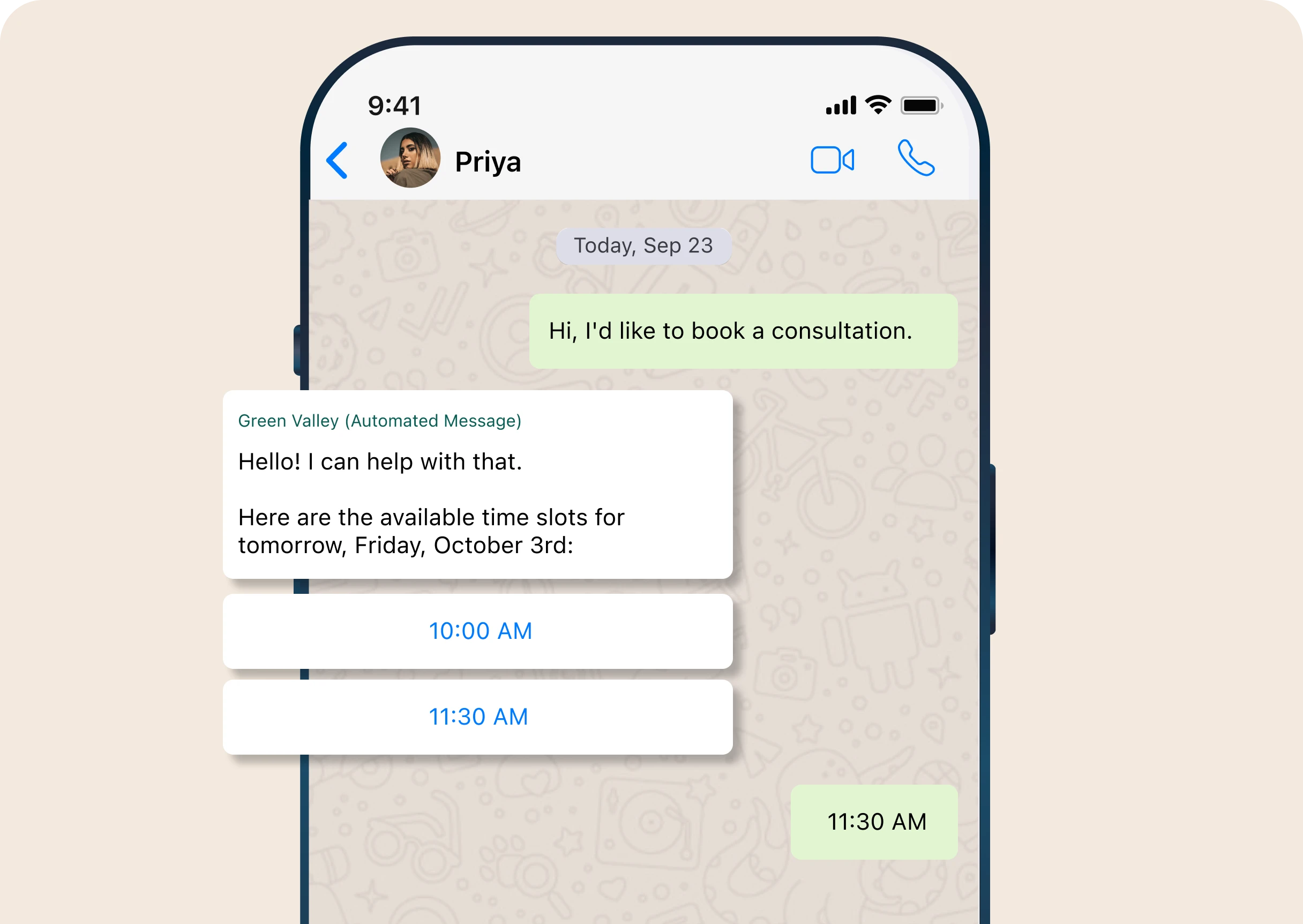 Allow clients to view real-time availability, easily book appointments, and receive instant confirmation notifications—all within WhatsApp for professional services. This seamless scheduling experience reduces no-shows, improves convenience, and saves time for both clients and service providers. Automate reminders and follow-ups to ensure every consultation is efficiently managed and runs smoothly.