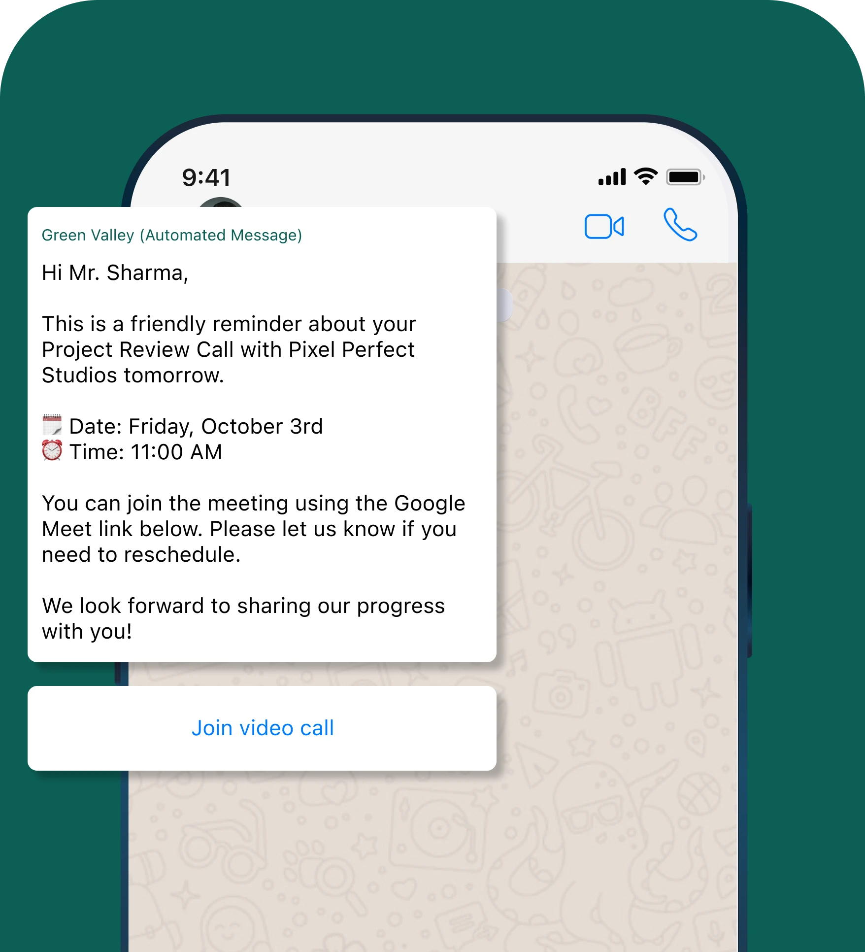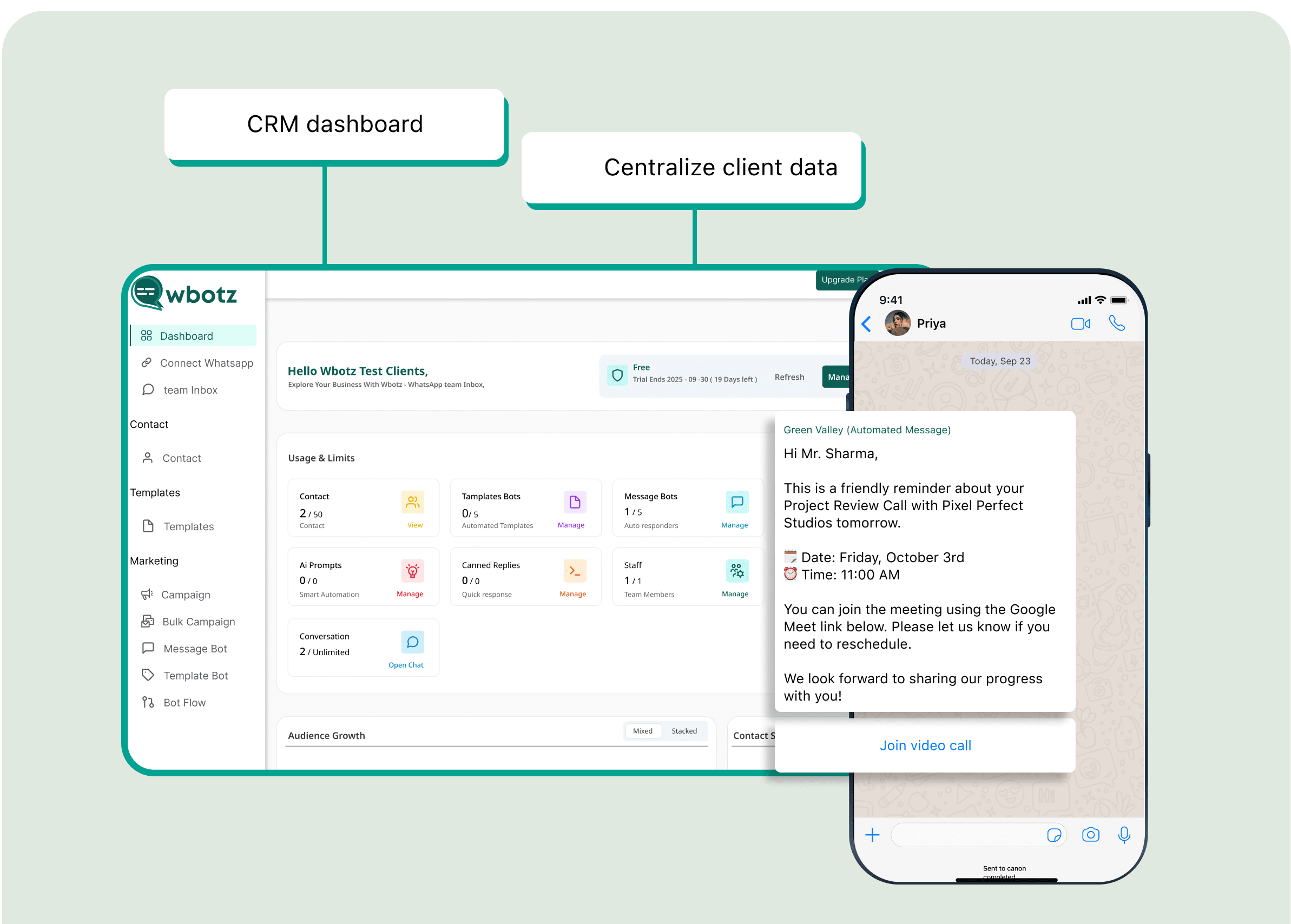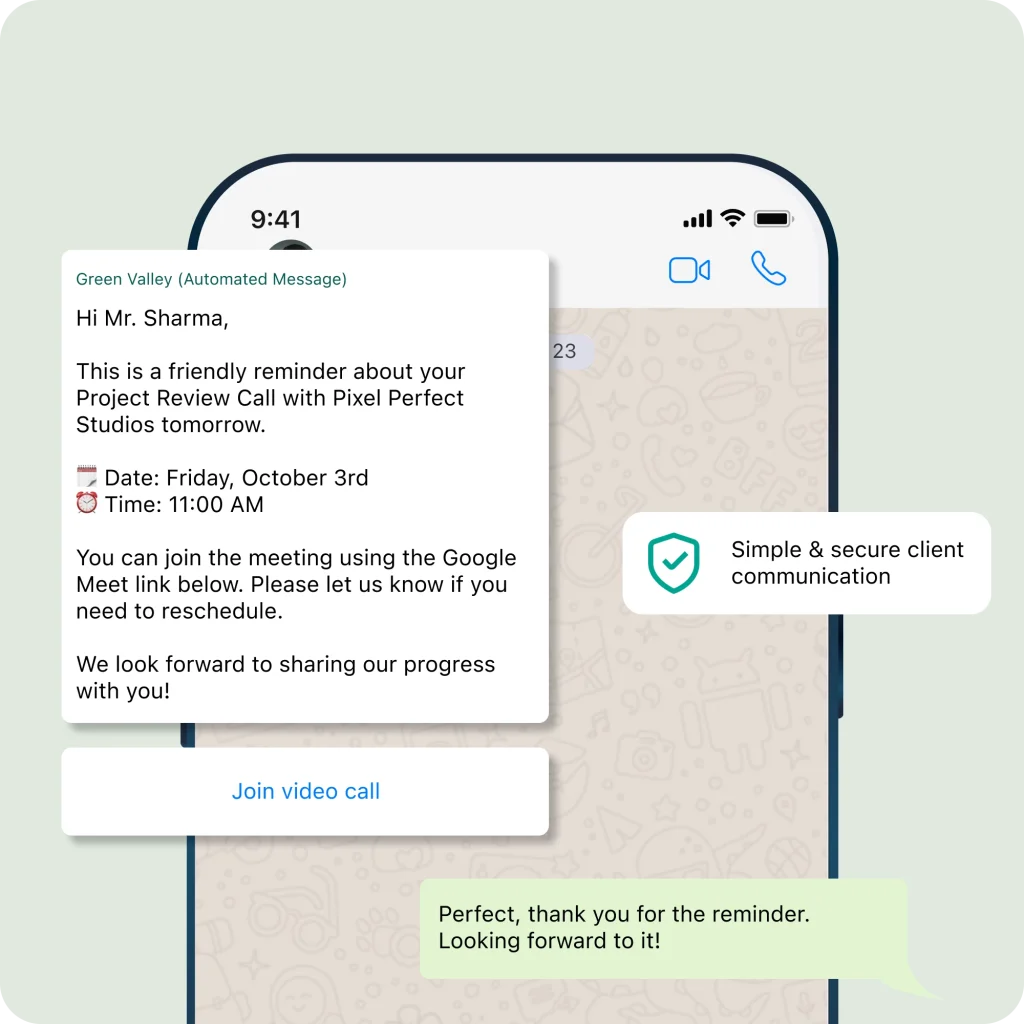 Manage every consultation, project update, and client inquiry efficiently through WhatsApp. Delight clients with instant responses, automated scheduling, and timely reminders—while keeping all messages confidential, organized, and easily accessible in one place. Streamline communication to make service delivery seamless, personal, and professional, strengthening client relationships at every step and enhancing overall satisfaction and trust.