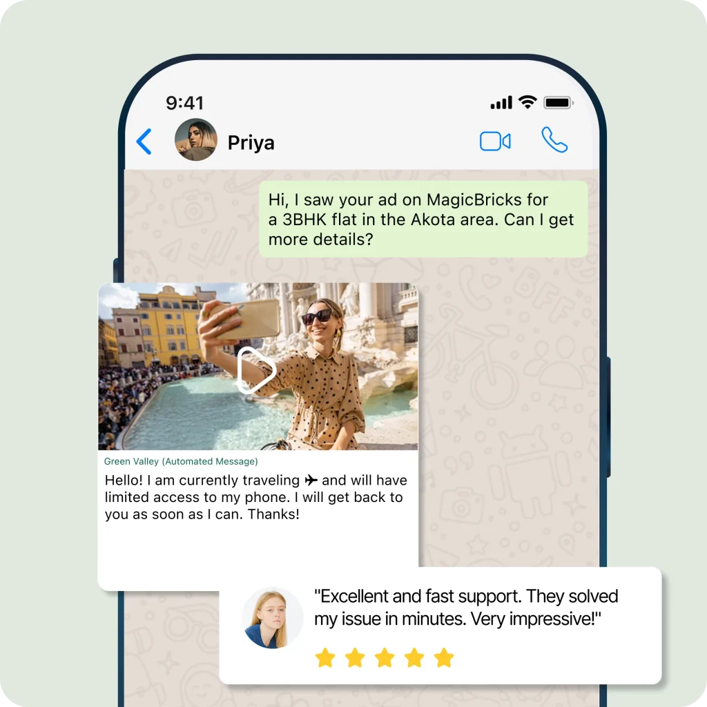 Connect with travelers and hotel guests at every step using WhatsApp for travel & hospitality—share booking confirmations, real-time updates, and detailed itineraries directly via WhatsApp for travel & hospitality. Enable instant concierge service and quick support to ensure stress-free journeys and memorable stays. Every WhatsApp for travel & hospitality message is an opportunity to enhance satisfaction and build customer loyalty.