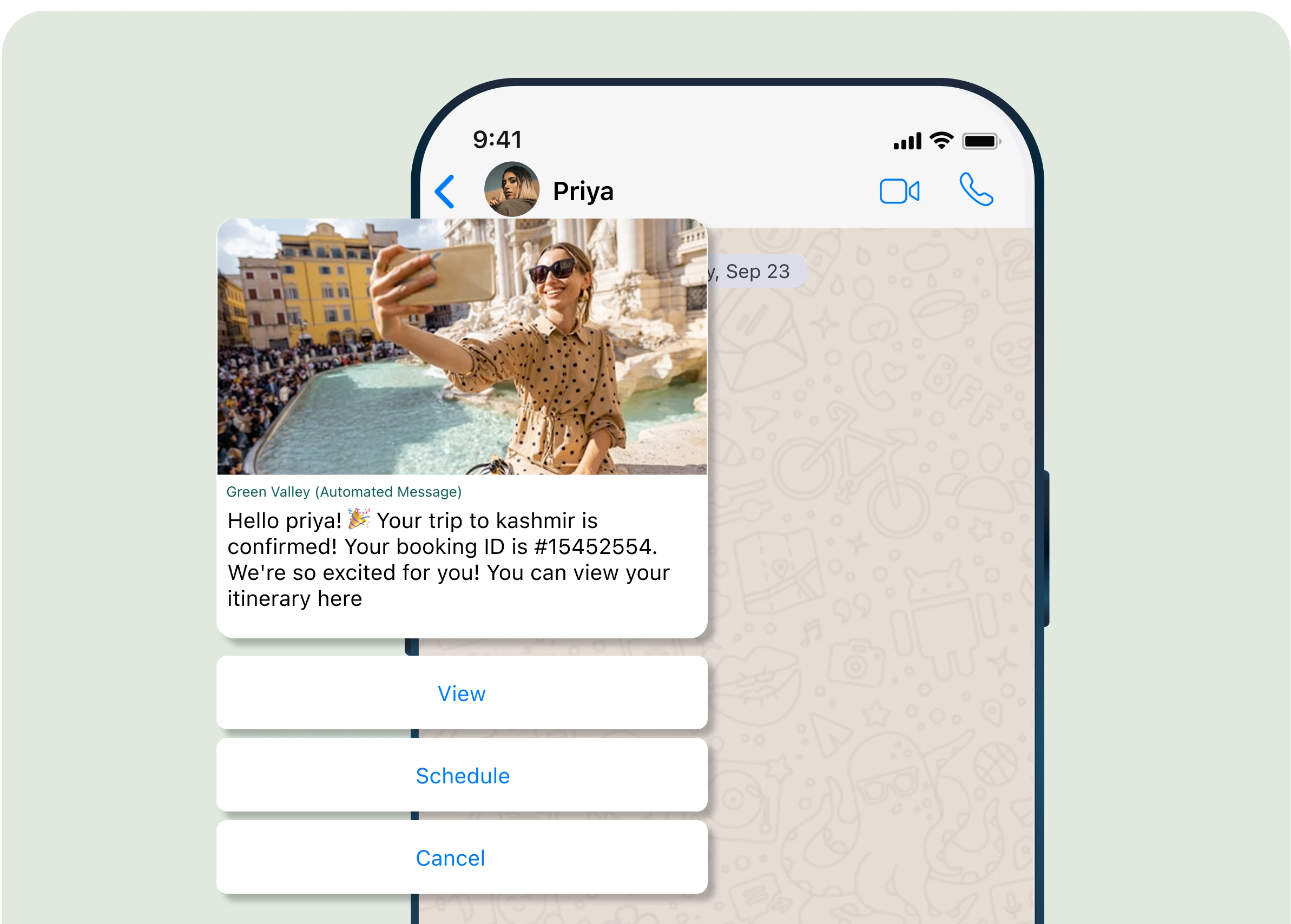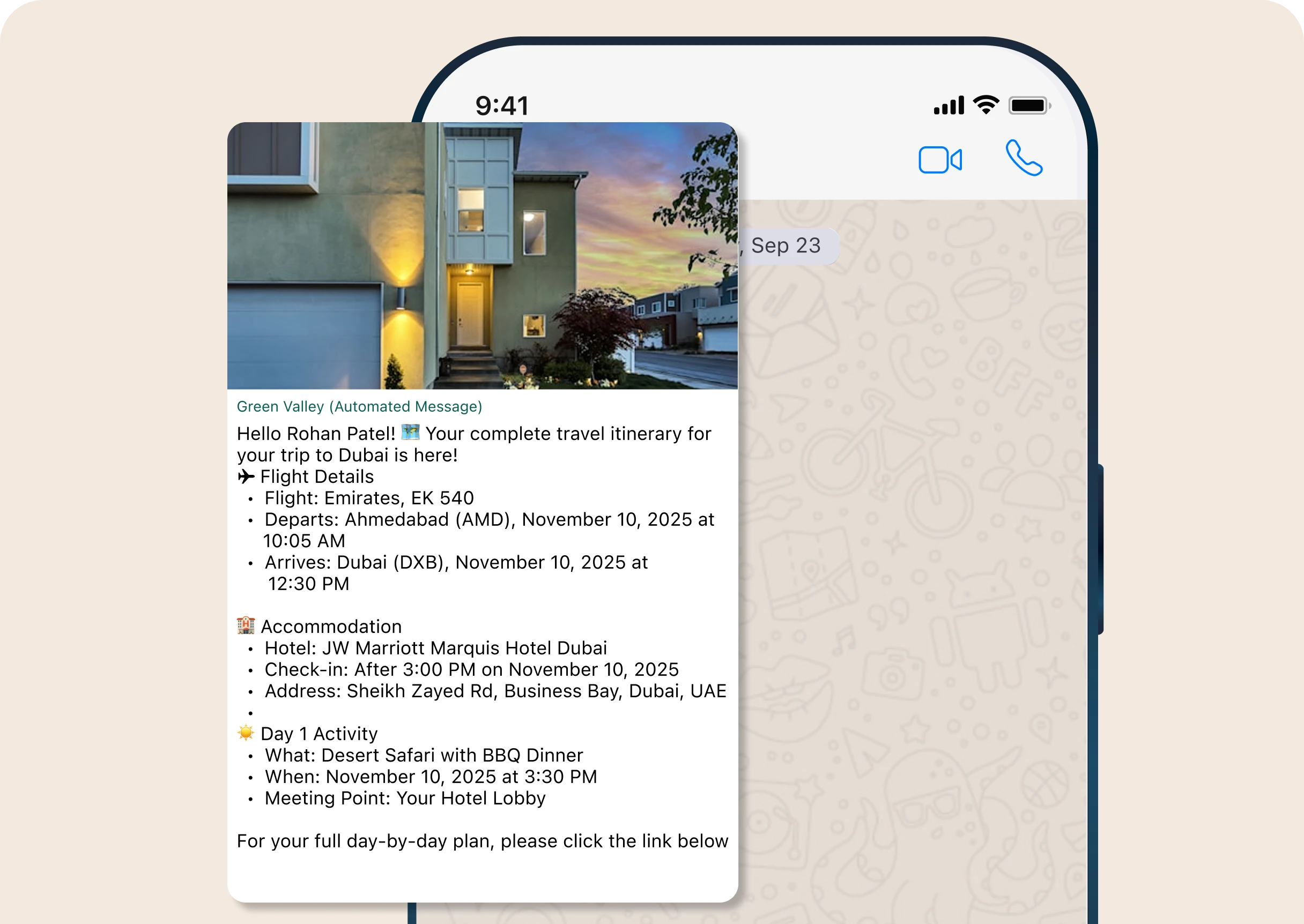 Deliver detailed, up-to-date travel plans directly to guests’ WhatsApp inbox with WhatsApp for travel & hospitality. Include flights, hotel stays, and activities for a seamless travel experience.