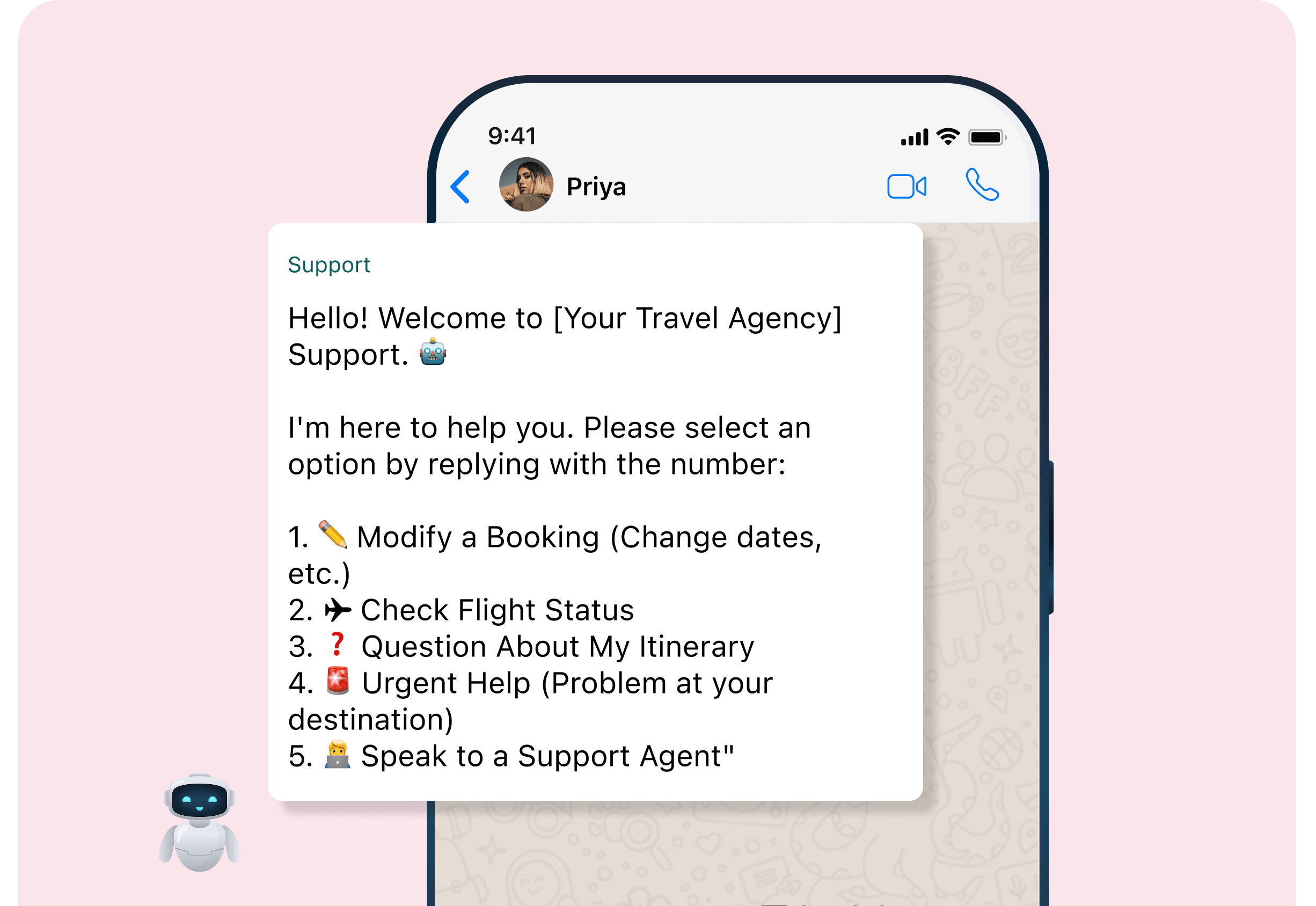 Offer 24/7 AI-driven virtual assistance via WhatsApp for travel & hospitality to handle traveler queries, local tips, and emergency support anytime, anywhere.