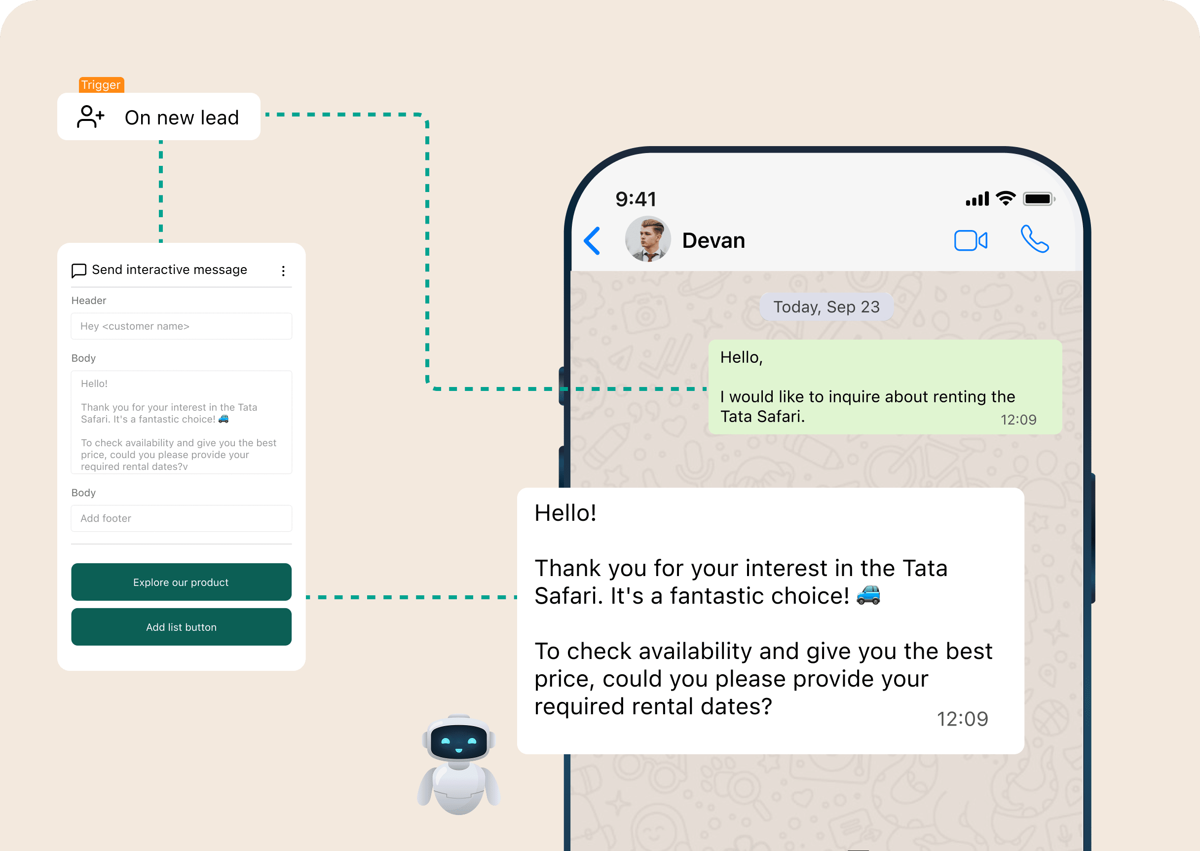 Capture inquiries and qualify leads with conversational chatbots and quick replies powered by WhatsApp marketing for automotive. Segment buyers by model interests, budget, or location and send personalized recommendations to keep them engaged at every step.