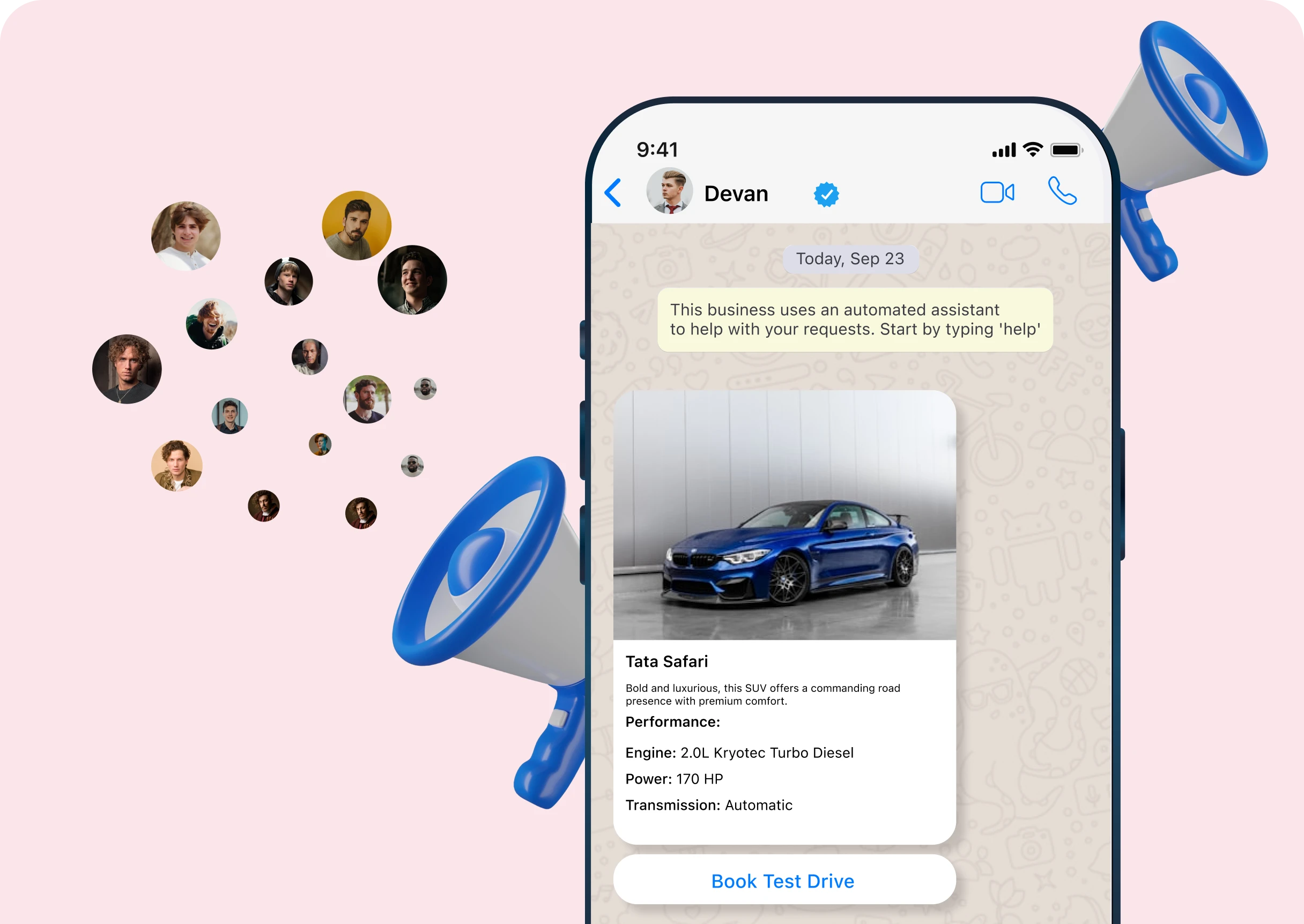 Absolutely. Using WhatsApp broadcast or bulk messaging, dealerships can send targeted promotions, event invites, and new model announcements to thousands of opted-in contacts at once.