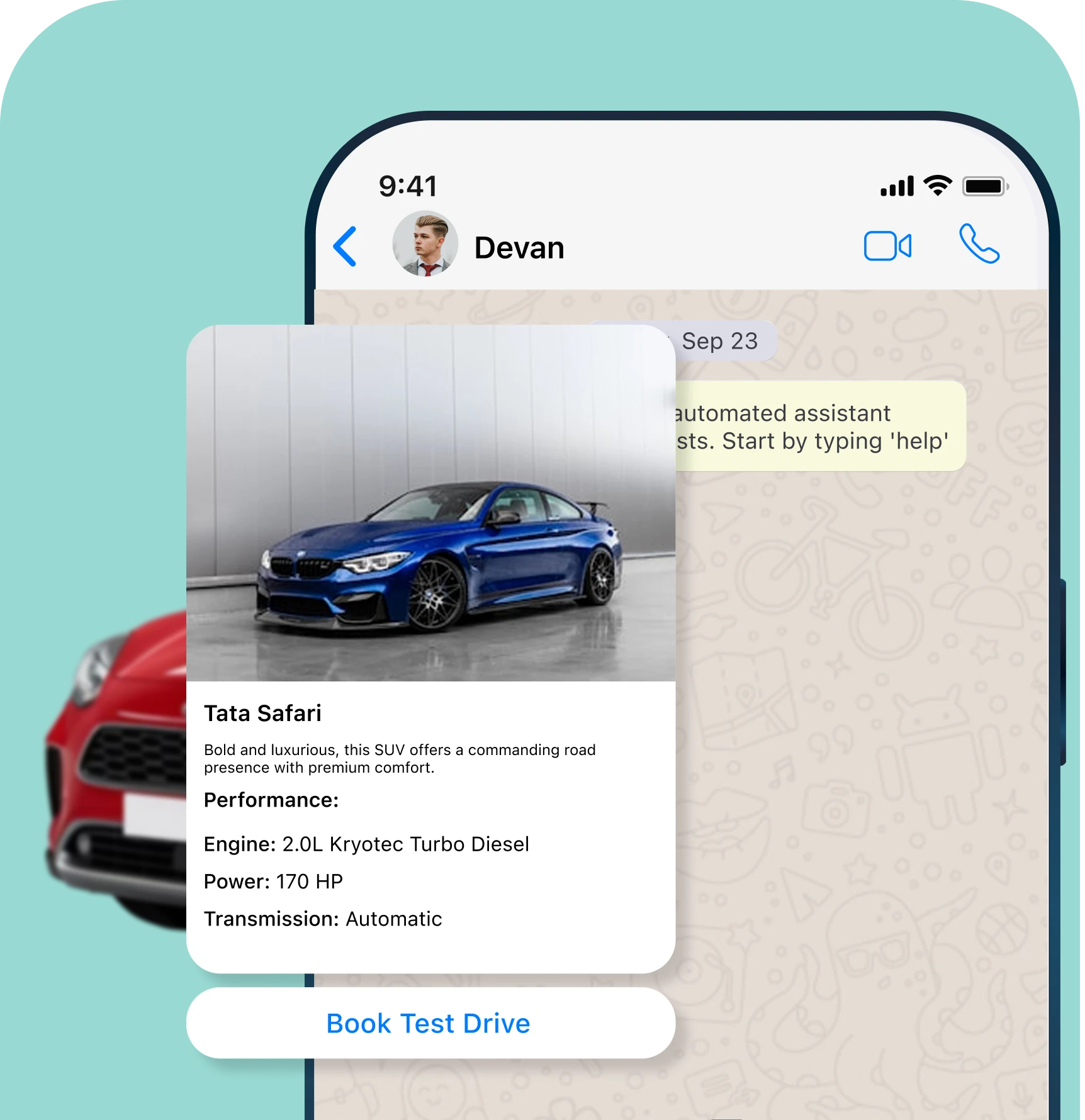 Engage car buyers and service customers instantly through WhatsApp marketing for automotive—the preferred messaging platform that drives faster responses, better lead qualification, and seamless appointment scheduling. Automotive dealerships and workshops can leverage WhatsApp automation to convert inquiries into test drives, automate service reminders, and share multimedia-rich vehicle brochures effortlessly to boost sales and customer satisfaction.