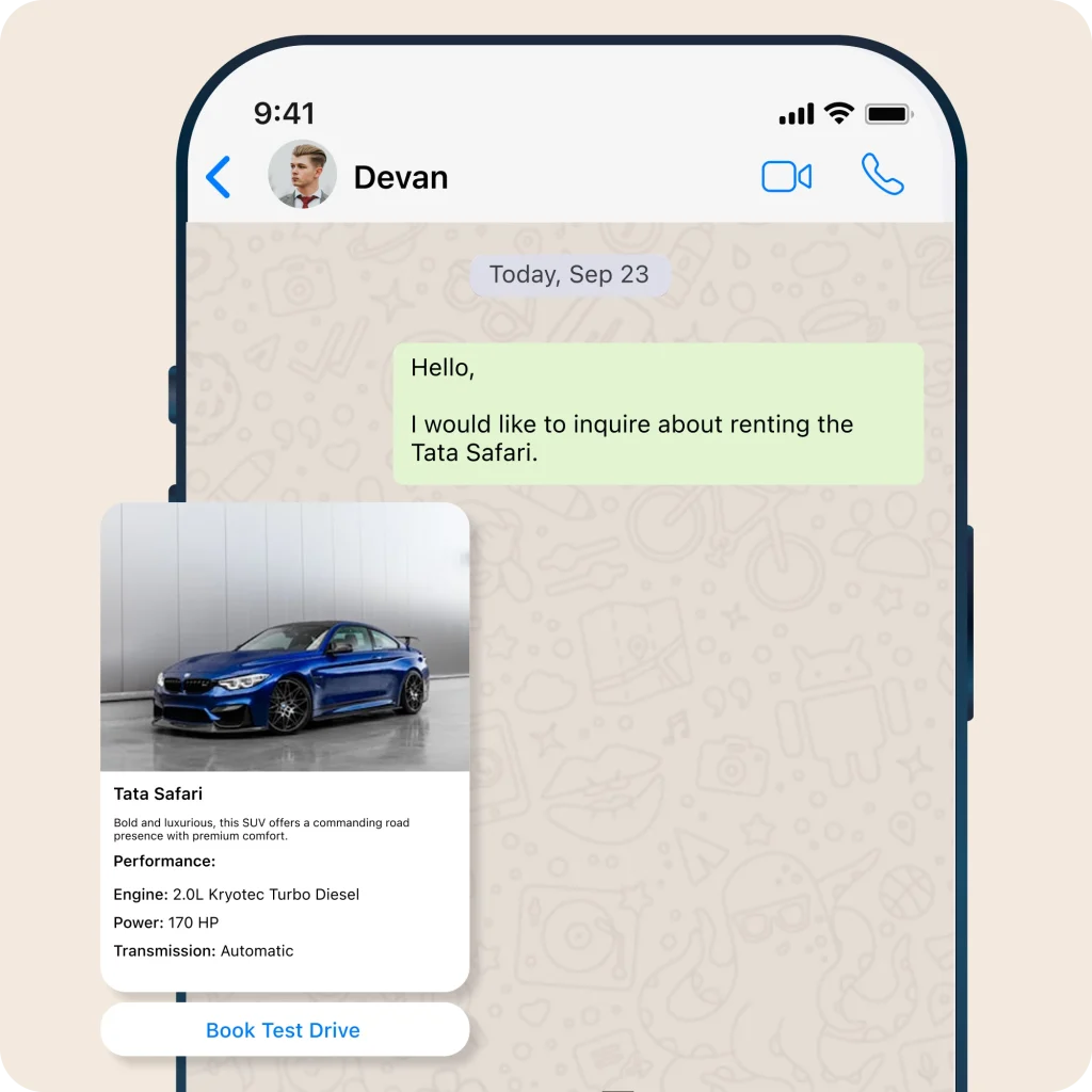 Empower dealerships, workshops, and vehicle service centers to connect with customers on their favorite messaging app. WhatsApp delivers instant, personalized conversations—enabling car dealers to capture leads, qualify prospects, and manage service bookings efficiently, all from a single platform.