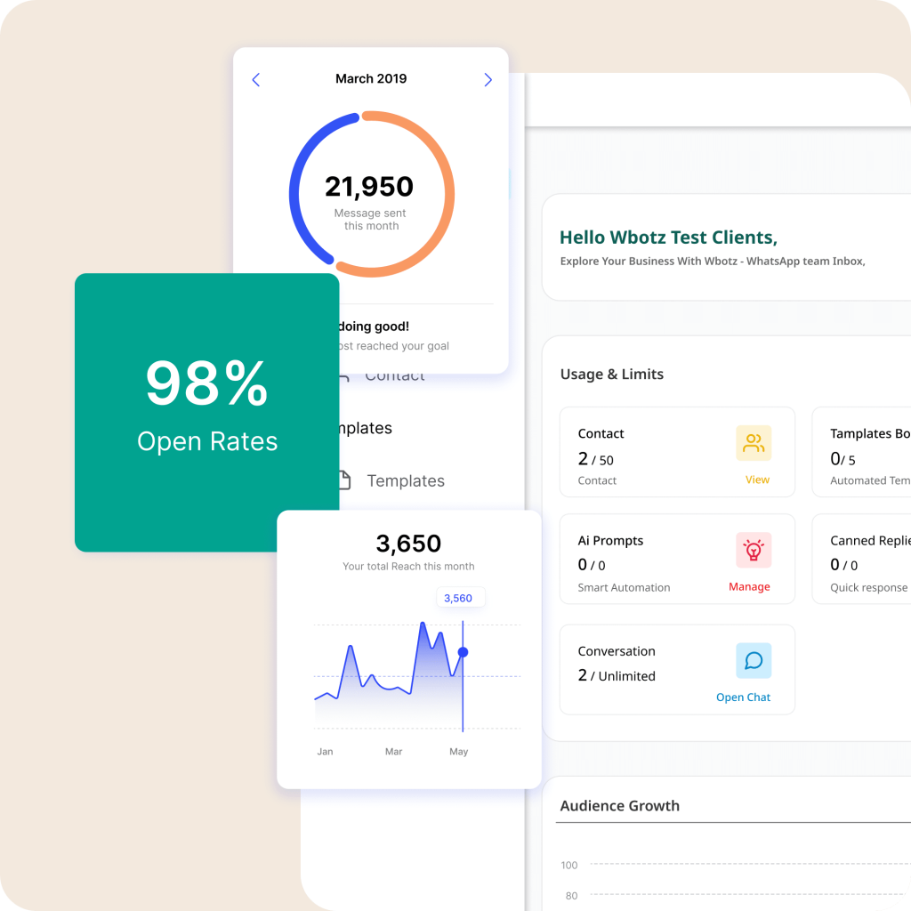 wbotz empowers you to send WhatsApp bulk broadcast messages with industry-leading delivery rates, leveraging the official WhatsApp Business API enhanced by Marketing Message Lite (MM Lite) for optimized performance. Experience open rates as high as 98%, dramatically outperforming traditional email and SMS channels. Schedule your broadcasts to coincide with peak engagement periods, holidays, or special events, maximizing the impact of every message.