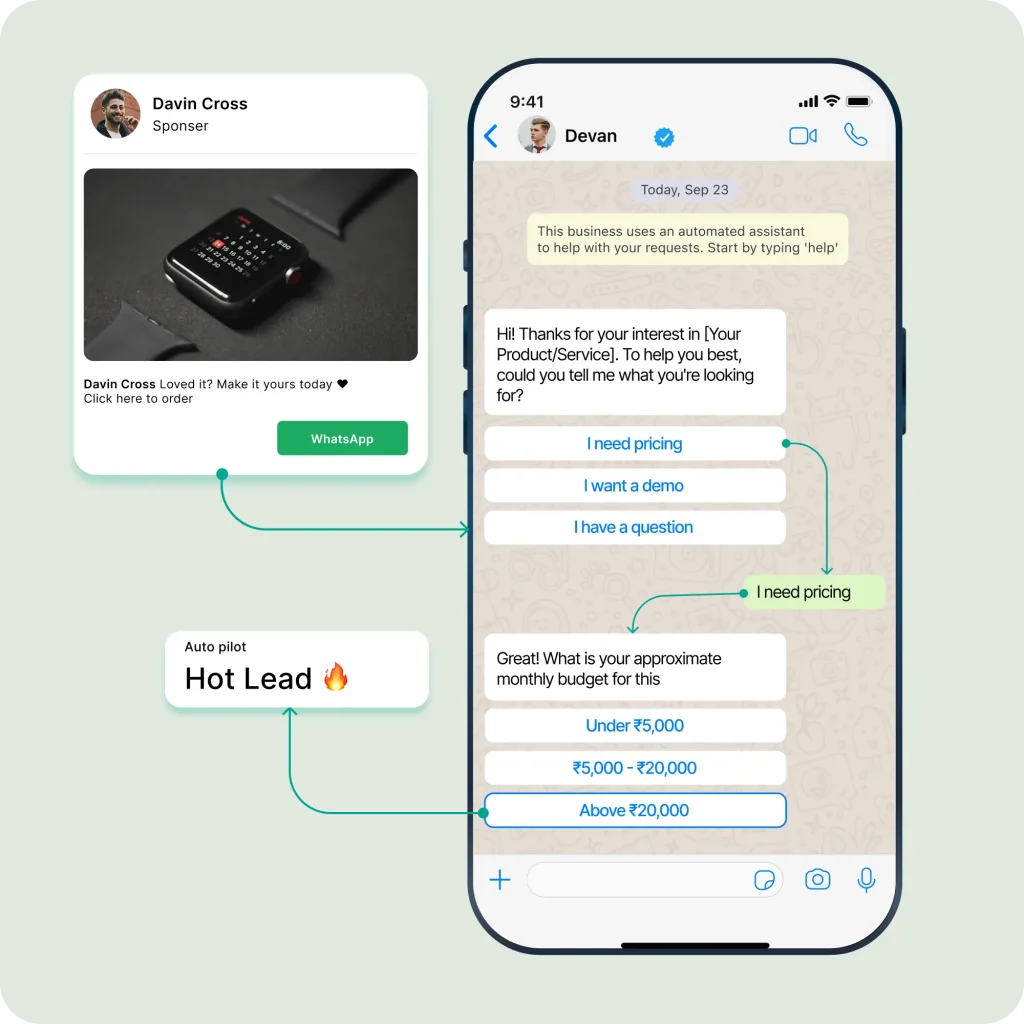 The WhatsApp Chatbot actively engages prospects, gathers key information such as budget and timeline, and routes promising leads to sales reps. By automating the qualification process, your team focuses only on high-value opportunities, boosting efficiency and results.