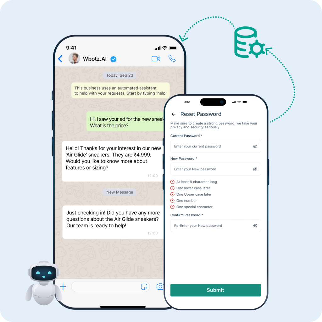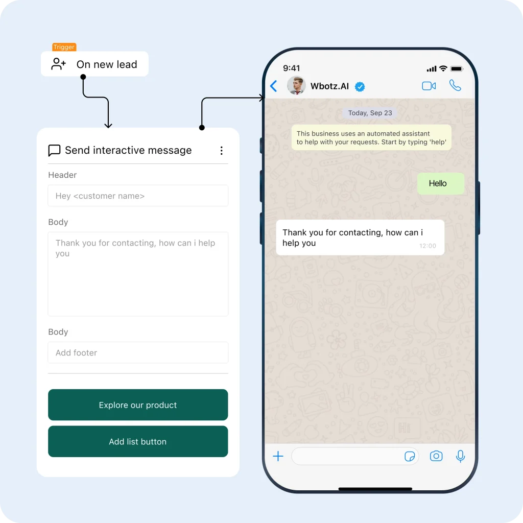 Embed mobile-friendly lead forms or use our conversational chatbots to gather customer details during WhatsApp chats. Automatically validate phone numbers, collect names, emails, and custom attributes, then tag and segment leads in real time.