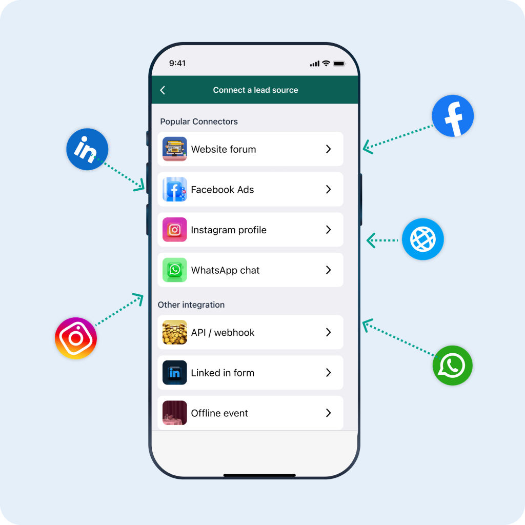 Capture leads from website sign-up forms, landing pages, Facebook and Instagram ads, offline CSV uploads, and any third-party tool that supports API or webhook integrations.