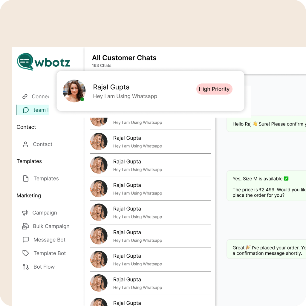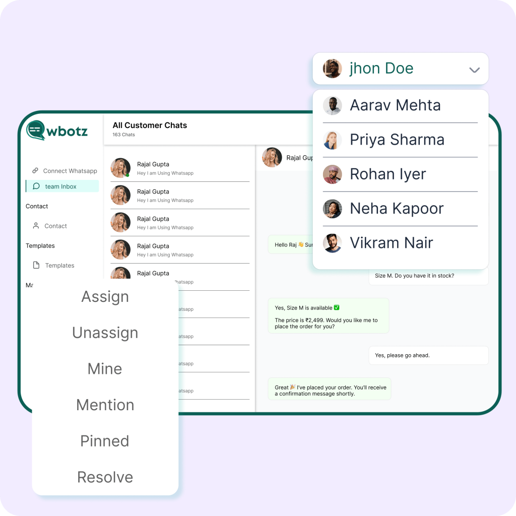 Manage your entire customer communication on WhatsApp from a centralized, shared WhatsApp team inbox designed for multi-agent collaboration. With wbotz, multiple team members can access a single WhatsApp number to read, respond to, assign, and track conversations—eliminating message overload and improving response times without confusion or missed chats.