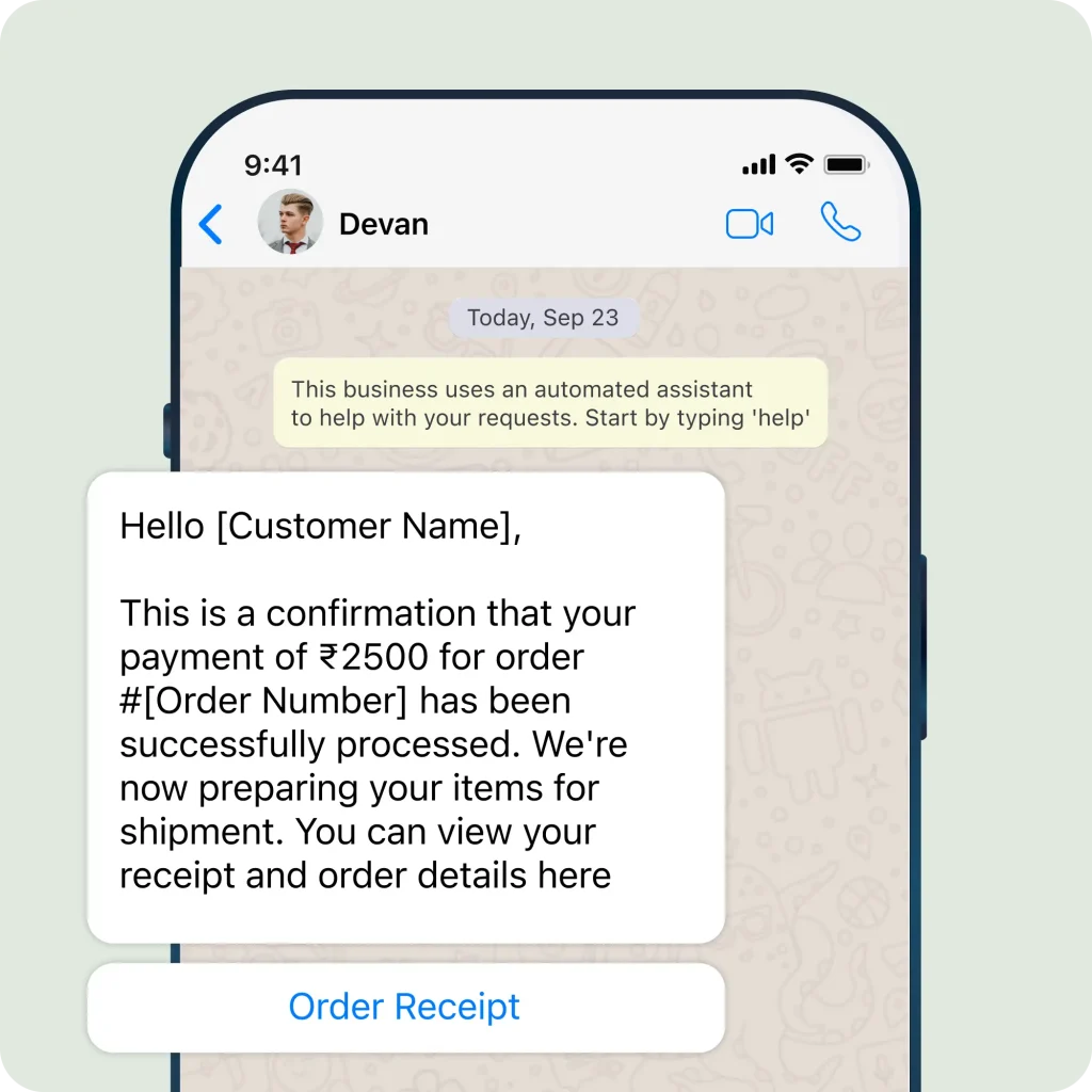 Deliver instant order confirmation and status alerts to keep customers informed every step of the way. From purchase to delivery, WhatsApp transactional messages provide real-time visibility, helping customers trust your process and reducing the need for follow-up inquiries.